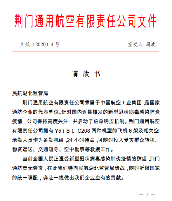 “當(dāng)前全國(guó)人民正遭受新型冠狀病毒感染的肺炎疫情的肆虐,荊門(mén)通航責(zé)無(wú)旁貸,特向民航湖北監(jiān)管局請(qǐng)戰(zhàn),隨時(shí)聽(tīng)候國(guó)家的統(tǒng)一調(diào)配,奔赴一線,做出企業(yè)應(yīng)有的貢獻(xiàn)”,1月28日,荊門(mén)通航鄭重向民航湖北監(jiān)管局遞交請(qǐng)戰(zhàn)書(shū),主動(dòng)請(qǐng)戰(zhàn),為抗擊新型冠狀病毒肺炎疫情保障工作隨時(shí)待命。