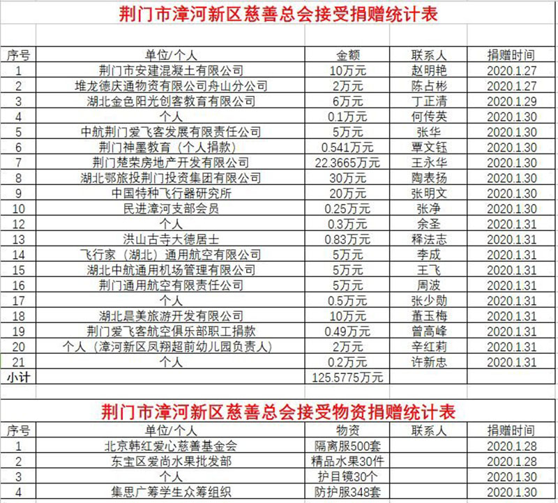 1月31日,為更好救治病患,荊門(mén)通航又響應(yīng)“一方有難,八方支援”號(hào)召,為荊門(mén)市漳河新區(qū)慈善總會(huì)捐贈(zèng)5萬(wàn)元,用于購(gòu)買(mǎi)各類物資。
