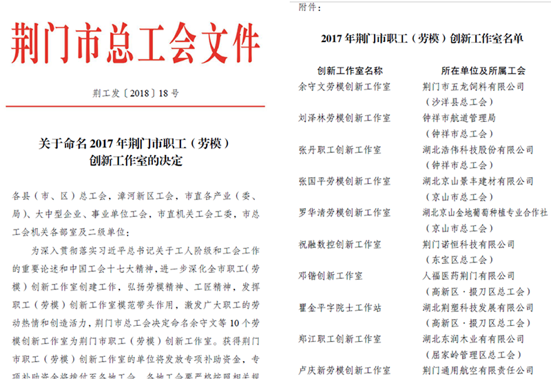 近日,荊門通航盧慶新勞模創(chuàng)新工作室順利通過(guò)荊門市總工會(huì)驗(yàn)收,喜獲荊門市職工(勞模)創(chuàng)新工作室稱號(hào)。 2016 年 4 月 29 日,公司盧慶新同志被荊門市人民政府授予荊門市勞動(dòng)模范